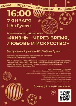 7 января в 16.00 состоится музыкальный концерт под руководством заслуженного учителя РФ Любови Гулько. В программе примут участие лауреаты всероссийских и международных конкурсов, обладатели Президентского гранта.